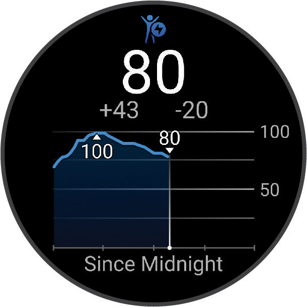 워치는 사용자의 심박수 변이, 스트레스 수준, 수면의 질, 활동 데이터를 분석하여 전체적인 바디 배터리 수준을 알아냅니다. 자동차의 연료량 표시처럼 이것은 사용자에게 남아 있는 에너지의 양을 보여줍니다. 바디 배터리의 범위는 0~100 이며, 여기에서 0~25 범위는 낮은 에너지가 남아 있음을 의미하고, 26~50은 중간 정도의 에너지가 있음을 의미하며, 51~75 범위는 높은 에너지를 의미하며, 76~100은 매우 높은 에너지가 있음을 의미합니다.