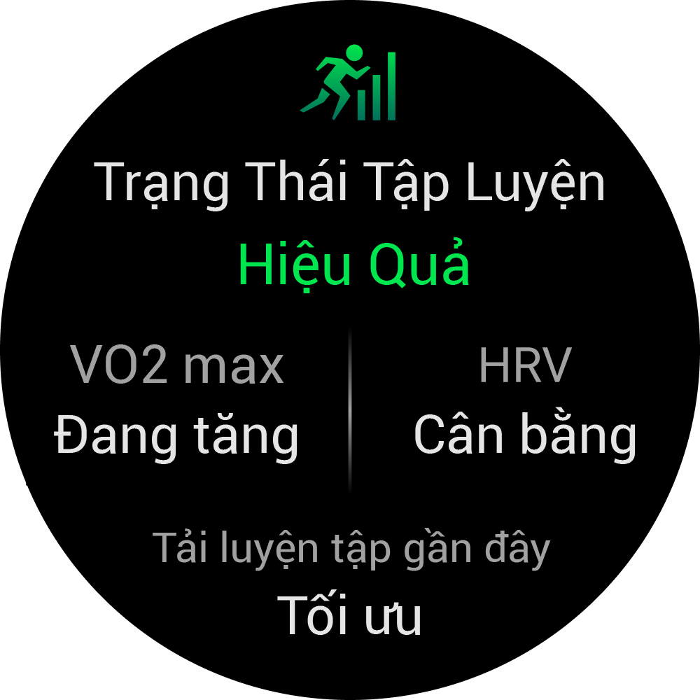 Trạng thái luyện tập: Trạng thái luyện tập cho biết việc luyện tập ảnh hưởng đến thể lực và hiệu suất của bạn như thế nào. Trạng thái luyện tập của bạn dựa trên các thay đổi về chỉ số VO2 tối đa, tải cường độ luyện tập, và trạng tháu tahy đổi nhịp tim trong khoảng thời gian dài.