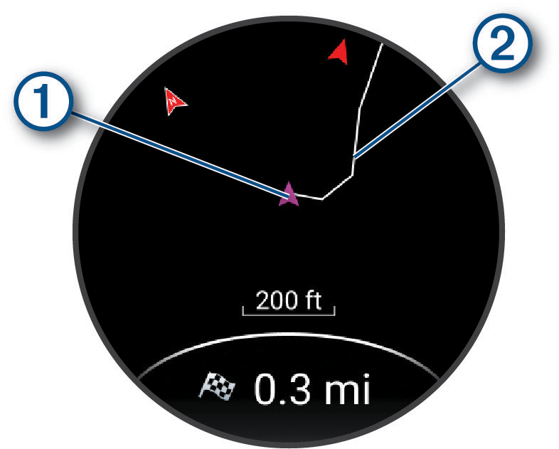 导航至起点您可以导航回路线起点或沿迹返航,但此功能仅适用于 GPS 有开启的活动。 活动中按下 STOP 键。 选择 回到起点,然后选择一个选项:要沿走过的路线返回活动的起点,选择 TracBack。如果设备未安装地图或是直接使用航线,请选择 航线 以直线导航回到活动的起点。如果不使用直线导航,请选择 航线,以转弯提示返回活动的起点。 你的目前位置 ①、航迹 ② 将显示在地图上。查看路线方向主页导航导航至起点
