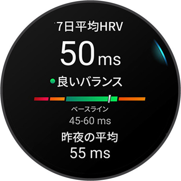睡眠中の光学式心拍計の測定値を分析して心拍変動(HRV)を表示します。トレーニングや身体活動、睡眠、栄養、健康習慣などのすべてがHRVに影響します。HRVの値は、性別や年齢、フィットネスレベルにより大きく異なります。HRVステータスのバランスが良いと、トレーニングとリカバリーのバランスが良く、心臓血管の健康状態が優れていて、ストレスからの回復力があるなど、健康状態が良い兆候であることを示します。HRVステータスのバランスが悪いと、疲労や十分な回復の必要性、高いストレスなどの兆候を示します。最良の結果を得るには、睡眠中にもデバイスを装着してください。デバイスに3週間分の安定した睡眠データが蓄積されることで、HRVステータスが表示されます。
