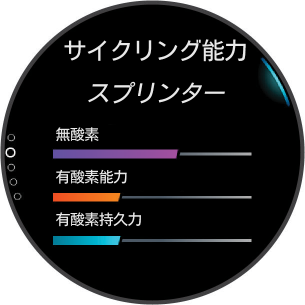 サイクリング能力は、有酸素持久力、有酸素能力、および無酸素能力の3つのカテゴリーにわたるパフォーマンスの測定値です。サイクリング能力では、現在の走行タイプが判定されます。(例: クライマー)走行中のデータやユーザープロフィールに登録された情報に基づいて走行タイプなどが判定され、ユーザーの能力の理解に役立ちます。( ユーザープロフィールを設定する)
