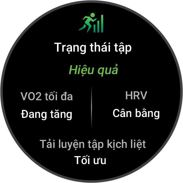 Trạng thái luyện tập: Trạng thái luyện tập cho biết việc luyện tập ảnh hưởng đến thể lực và hiệu suất của bạn như thế nào. Trạng thái luyện tập của bạn dựa trên các thay đổi về chỉ số VO2 tối đa, tải cường độ luyện tập, và trạng tháu tahy đổi nhịp tim trong khoảng thời gian dài.