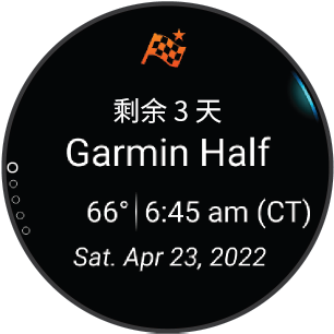 赛事日历和主要赛事当在您的Garmin Connect日历中添加赛事时,你可以在主要赛事小工具中查看此赛事(小工具)。赛事日期必须在未来365天内。手表会显示赛事倒计时,你的目标时间或预测完成时间(仅限赛事),以及天气信息。注意:可以获得比赛地点和日期的历史天气信息。当地的预报数据大约在赛事发生前14天显示。如果添加了多个赛事,需要选择一个主要赛事。根据你赛事的路线信息,您可以查看海拔数据、路线,并添加配速策略计划(PacePro 配速策略)。赛事助手主页训练赛事日历和主要赛事