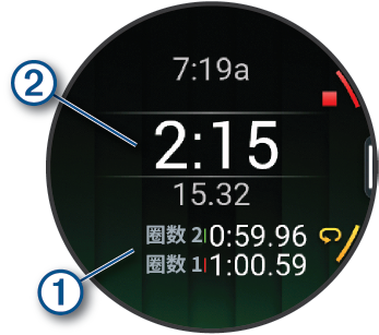 使用秒表 按 键。 选择 时间 > 秒表。 按下 开始活动计时。 按 重启单圈计时 ①。 秒表总计时 ② 仍会继续计时。 按 键停止秒表计时。 选择一个选项:要重置秒表计时,选择 。要将秒表时间保存为一个活动,向左滑动屏幕,选择 保存活动。要启用或禁用圈记录,向左滑动屏幕,然后选择 计圈键。 主页时钟使用秒表