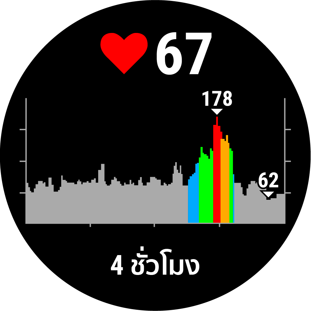 วิจิทแสดงอัตราการเต้นหัวใจปัจจุบันของคุณเป็นจังหวะการเต้นต่อนาที (bpm) และกราฟของอัตราการเต้นหัวใจสำหรับ 4 ชั่วโมงล่าสุดของคุณ