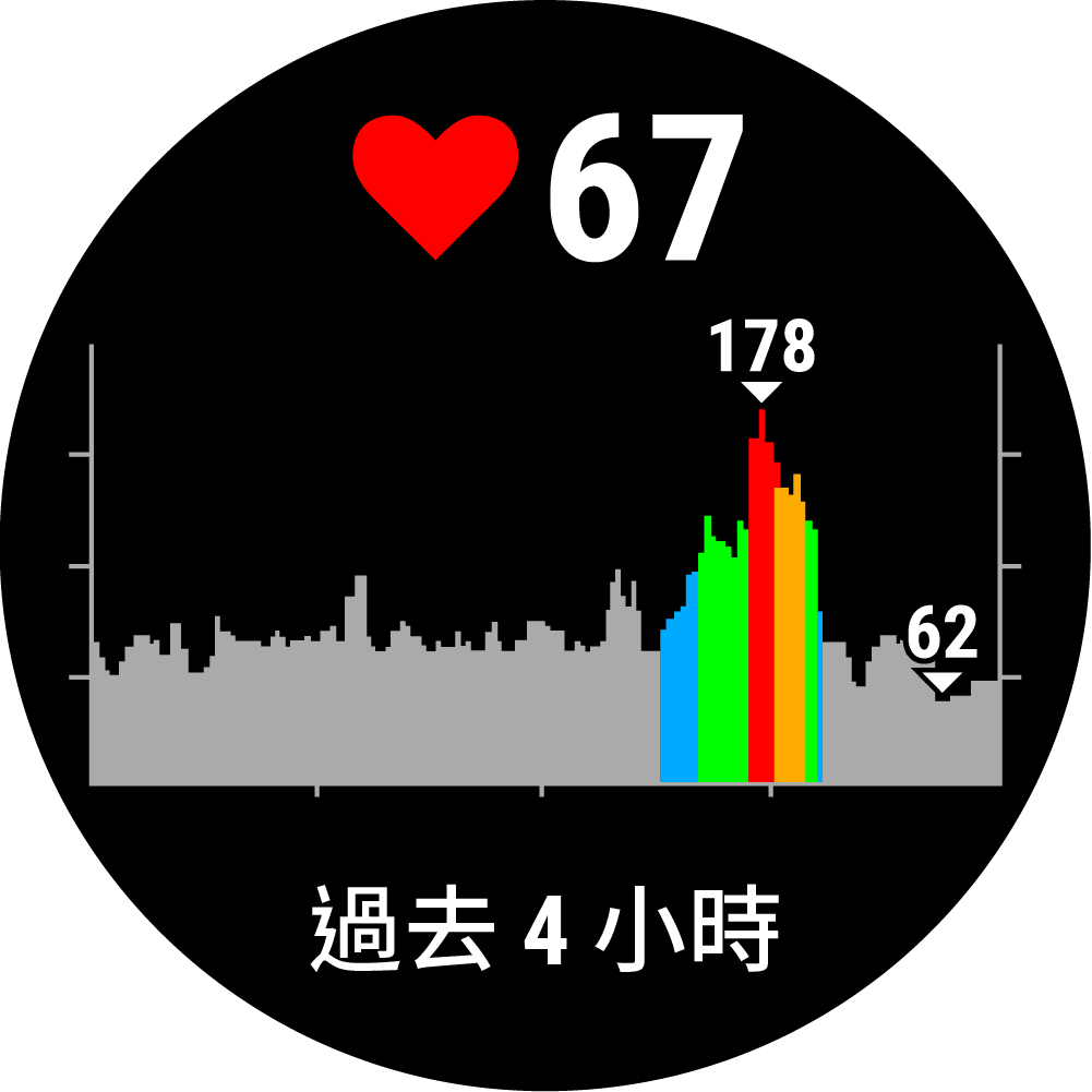 檢視心率小工具檢視您的目前心率(bpm)與過去四小時的心率圖。 在時間錶面,按下 UP 或 DOWN 鍵以檢視心率資訊。備註:您可能需要先將小工具新增至您的小工具目錄中(自訂 Widget 小工具排序)。 按下 START鍵檢視過去7天的平均靜止心率。 首頁心率功能手腕式心率檢視心率小工具
