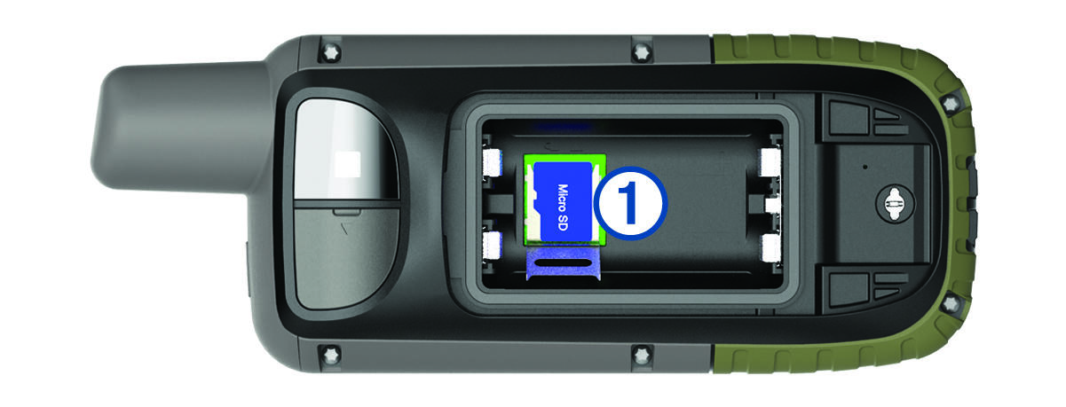 安装存储卡 警告请勿使用尖锐物品取出电池。安装 microSD 存储卡用于其他存储或预加载的地图。 逆时针旋转D形环,然后向上拉取下电池盖。 取出电池。 将卡夹 ① 滑至 并抬起。 将存储卡的金属触点朝下放置。 关闭卡夹。 将卡夹滑到 将其锁定。 装回电池及电池盖。 主页设备信息数据管理安装存储卡