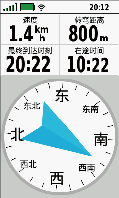电子罗盘使用罗盘导航至目的地时, 将始终指向目的地方向,并不因移动方向而改变。当 指向电子罗盘正上方,您正沿着目的地方向进行。如果 指向其他方向,原地旋转直至箭头指向电子罗盘正上方。使用电子罗盘航向指针 目测导航 电子罗盘设置主页主要页面电子罗盘