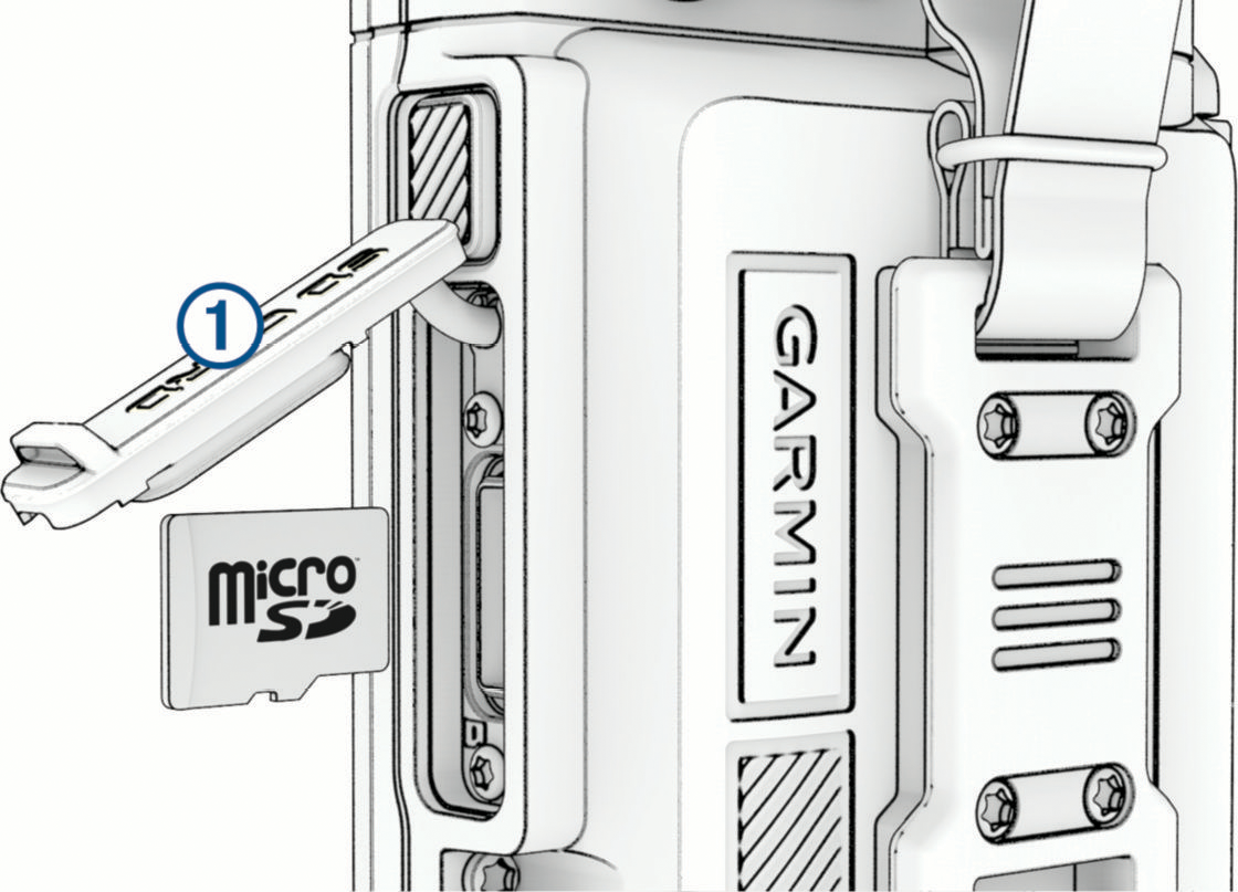 メモリーカードを挿入する保存容量を増やしたい場合や別売の地図を使用する場合に、microSDカード(最大1TBまで)を挿入します。 デバイスの側面にある防水カバー①を持ち上げます。 端子面が画面側を向いた状態でmicroSDカードを挿入します。(図では端子面が見えない向きになります) ホームデバイス情報データ管理メモリーカードを挿入する