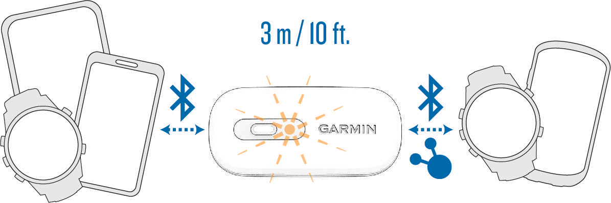 HRM 200と対応のGarmin製品やスマートウォッチ、タブレット、フィットネス機器をペアリングできます。( 接続タイプとLEDステータス)