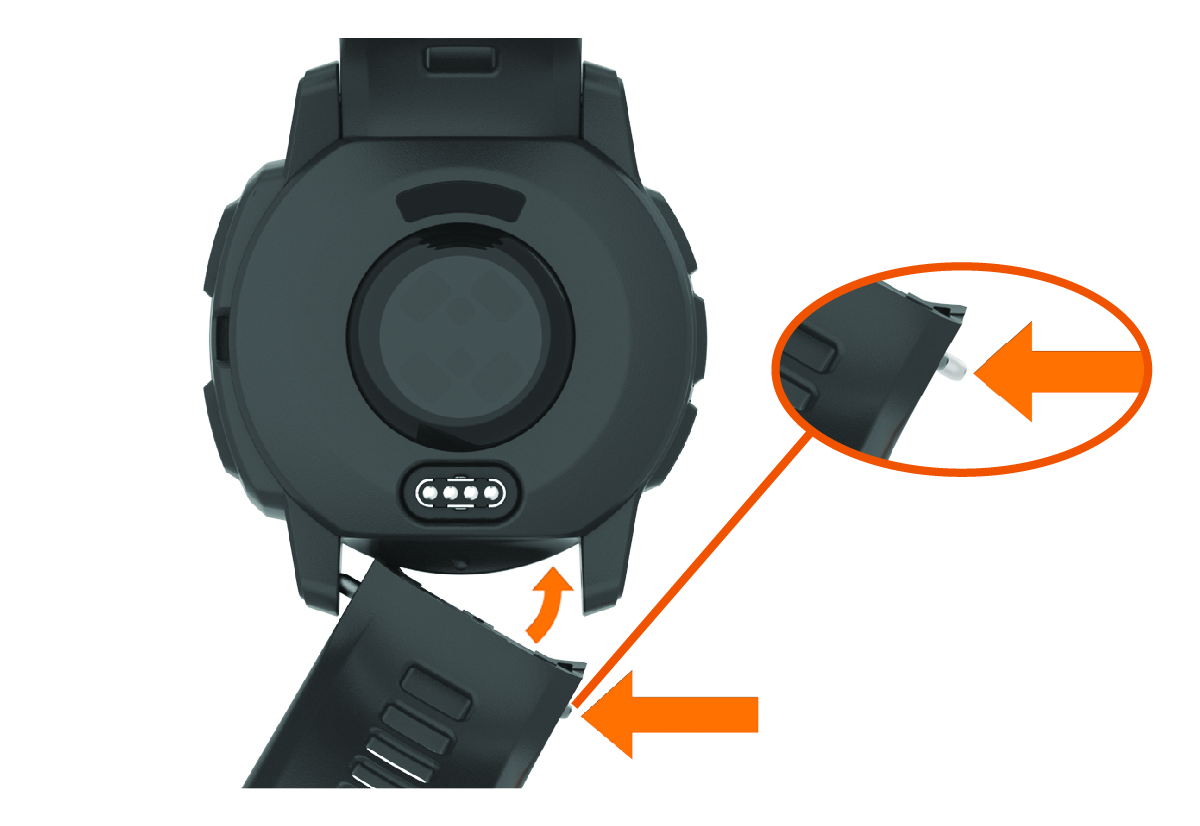 - Để lắp dây Instinct 2, căn chỉnh một bên của dây mới theo các lỗ trên thiết bị, ấn vào phần chốt lộ ra của đồng hồ, và ấn dây mới vào vị trí.