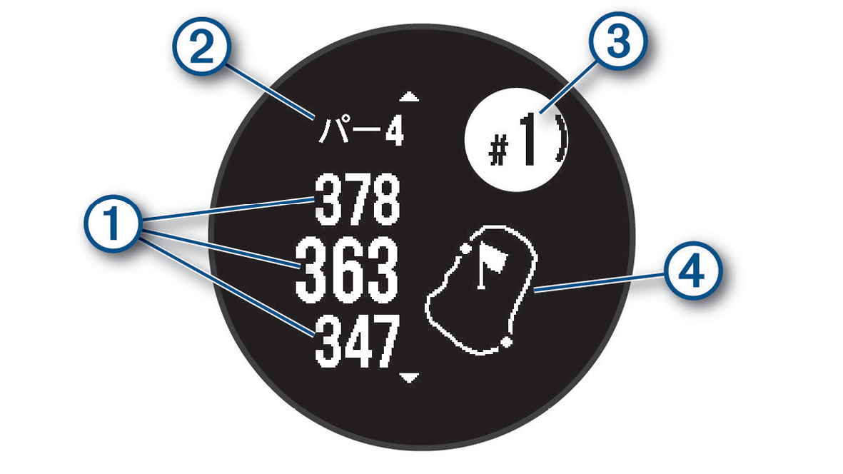 - 注意: 画面に表示されている数字は、グリーンの奥/中央/手前までの距離を示します。実際のグリーン上のピンの位置までの距離を表すものではありません。