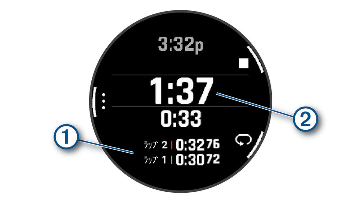 ストップウォッチを使用する 任意の画面でSETキーを長押しします。 [ストップウォッチ]を選択します。 GPSキーを押してタイマーを開始します。 ラップ を取得するには、SETキーを押します。ストップウォッチのタイムは に表示されます。 GPSキーを押してストップウォッチを停止します。 次のオプションを選択します。DOWNキーを押して合計タイムとラップタイムをリセットします。MENUキー>[アクティビティ保存]を選択して、タイムとラップをアクティビティとして履歴に保存します。MENUキー>[完了]を選択して、ストップウォッチ機能を終了します。MENUキー>[確認]を選択して、ラップタイムを確認します。注意:[確認]のオプションは、複数ラップ取得時のみ表示されます。MENUキー>[ウォッチフェイスに戻る]を選択して、ストップウォッチをカウントしたまま、ウォッチフェイスページに戻ります。MENUキー>[ラップキー]を選択して、ストップウォッチ画面のラップキーをオン/オフします。 ホームアラーム&タイマーストップウォッチを使用する