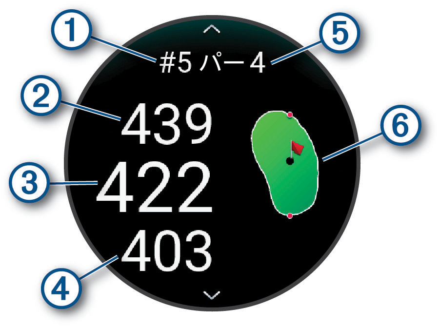 - 注意:画面に表示されている数字は、グリーンの奥/中央/手前までの距離を示します。実際のグリーン上のピンの位置までの距離を表すものではありません。