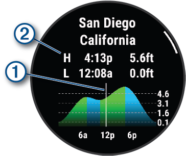 Khi bạn kết nối đồng hồ với điện thoại tương thích, bạn có thể xem thông tin về trạm thủy triều, bao gồm cả chiều cao thủy triều và thời điểm xuất hiện các đợt thủy triều cao và thấp tiếp theo.