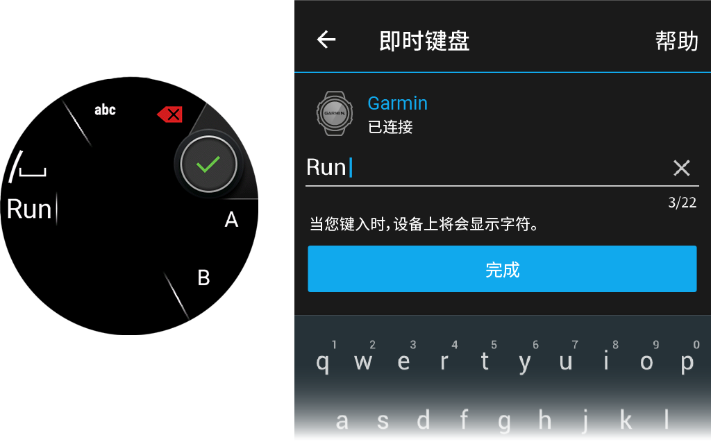 使用智能手机输入文字开启 Garmin Connect应用程序,使用智能手机的键盘快速输入文字至设备。当设备需要输入文字时,键盘将显示在Garmin Connect应用程序中。输入文字的同时,即会传送至设备。设备默认即时输入为开启状态。若要关闭即时输入,在Garmin Connect应用程序中选择 设置 > 快捷输入。备注:使用智能手机键盘输入文字前,必须开启Garmin Connect应用程序并与设备配对。主页手机连接功能使用智能手机输入文字