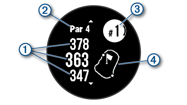 CATATAN: Karena lokasi pin berubah, jam tangan menghitung jarak ke depan, tengah, dan belakang dari green, tapi bukan lokasi pin sebenarnya.