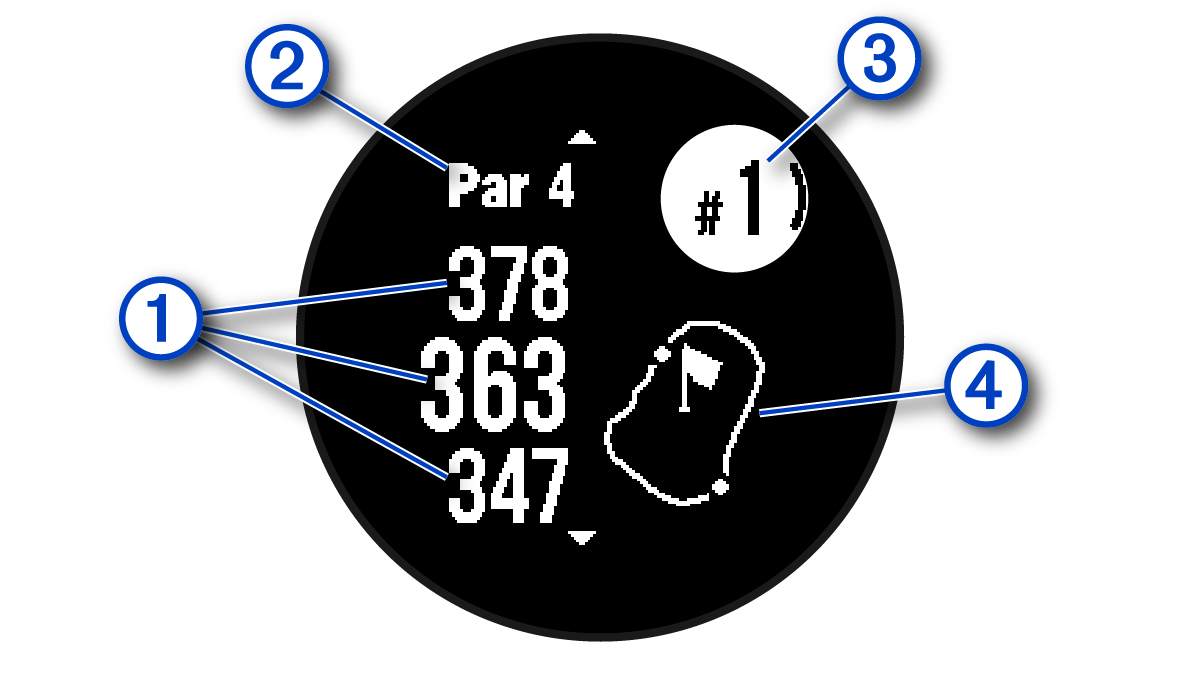 được thể hiện bằng một ký tự biểu thị thứ tự của các mối nguy hiểm trên lỗ, và bên dưới vùng green ở các vị trí gần đúng so với đường lăn bóng. - Vùng green được thể hiện dưới dạng nửa vòng tròn