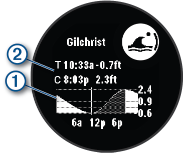 Khi bạn kết nối đồng hồ với điện thoại tương thích, bạn có thể xem thông tin về trạm thủy triều, bao gồm cả chiều cao thủy triều và thời điểm xuất hiện các đợt thủy triều cao và thấp tiếp theo.