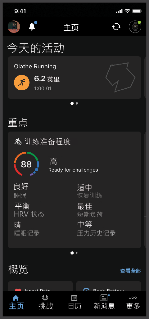可以使用 Garmin Connect 帐号将其他 Garmin 设备的活动和体能指标同步到设备。这可以让设备更准确地反映你的训练状态和体能。