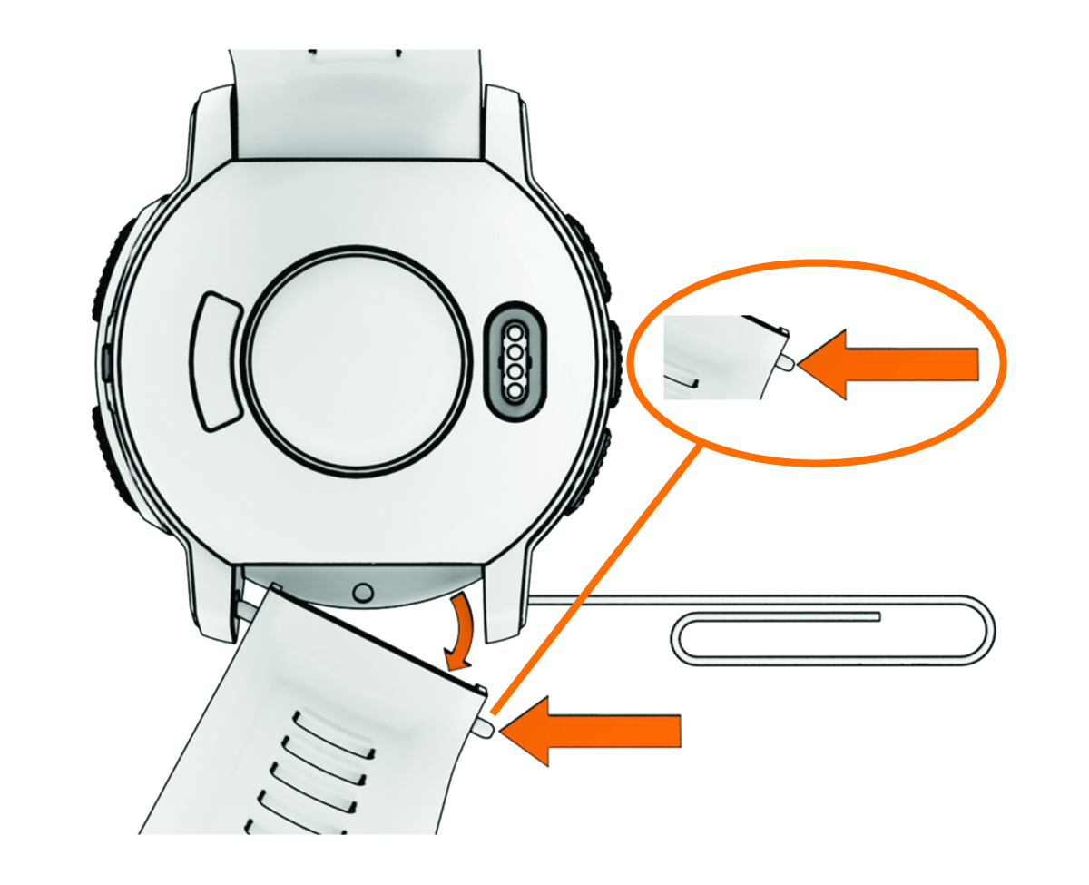 - QuickFit 22 밴드를 설치하려면, Instinct Crossover 밴드에서 시계 핀을 제거하고 이를 시계에 설치한 다음 새로운 밴드를 눌러서 끼웁니다.