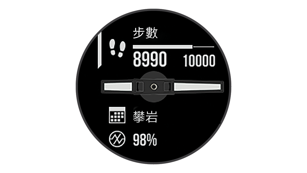 檢視概覽循環清單概覽可讓您快速取用健康數據、活動資訊、內建感測器等。手錶在配對後,即可檢視手機的資料,例如通知、天氣或行事曆。 按下 UP 鍵或 DOWN 鍵。 手錶將捲動概覽循環清單,並顯示各概覽的摘要資訊。 按下 START 鍵以檢視更多資訊。 選擇一個選項:按下 DOWN 鍵以檢視概覽的詳細資訊。按下 START 鍵以檢視概覽的更多選項與功能。 首頁外觀概覽檢視概覽循環清單