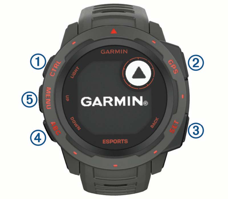 按鍵以切換小工具與目錄選單 長按以檢視高度計、氣壓計和電子羅盤(ABC)畫面 |