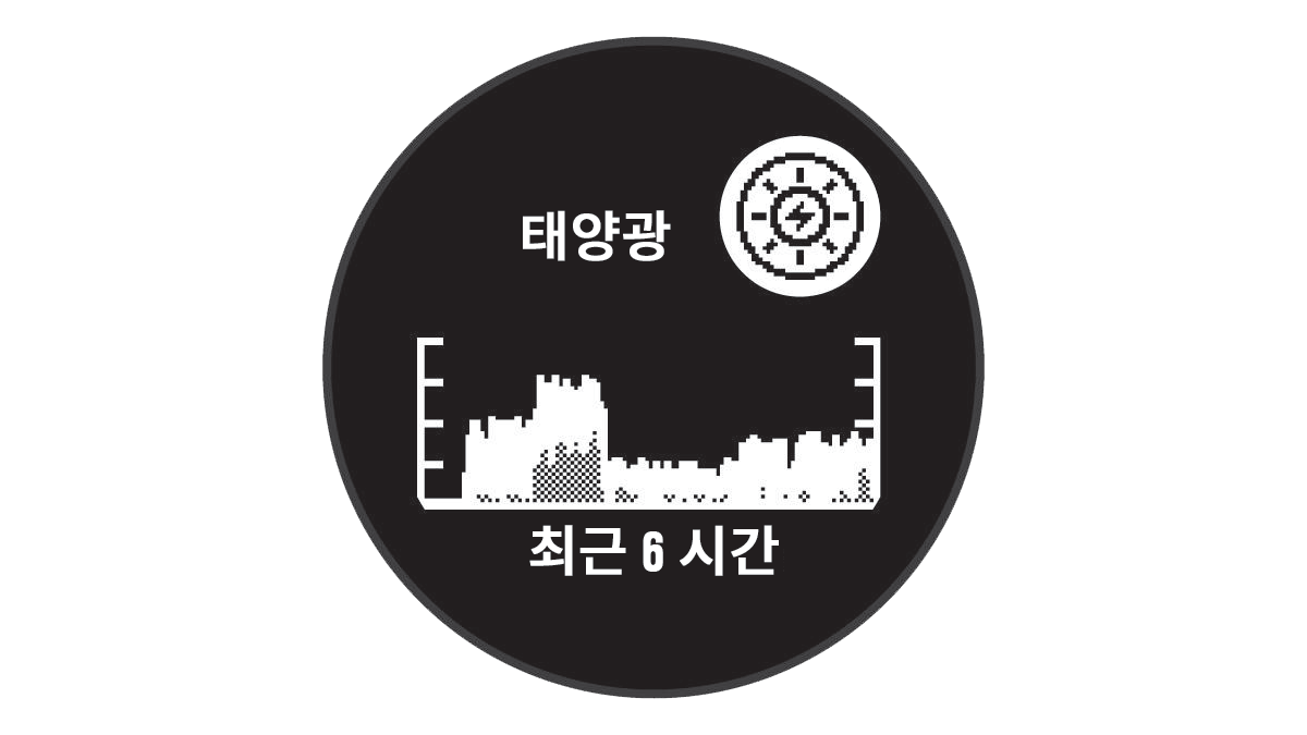 태양광 위젯 보기시계 화면에서 UP 또는 DOWN을 눌러 태양광 에너지 위젯으로 화면을 스크롤합니다. 지난 6 시간 동안 유입된 태양광의 강도의 그래프가 나타납니다.홈태양광 충전태양광 위젯 보기