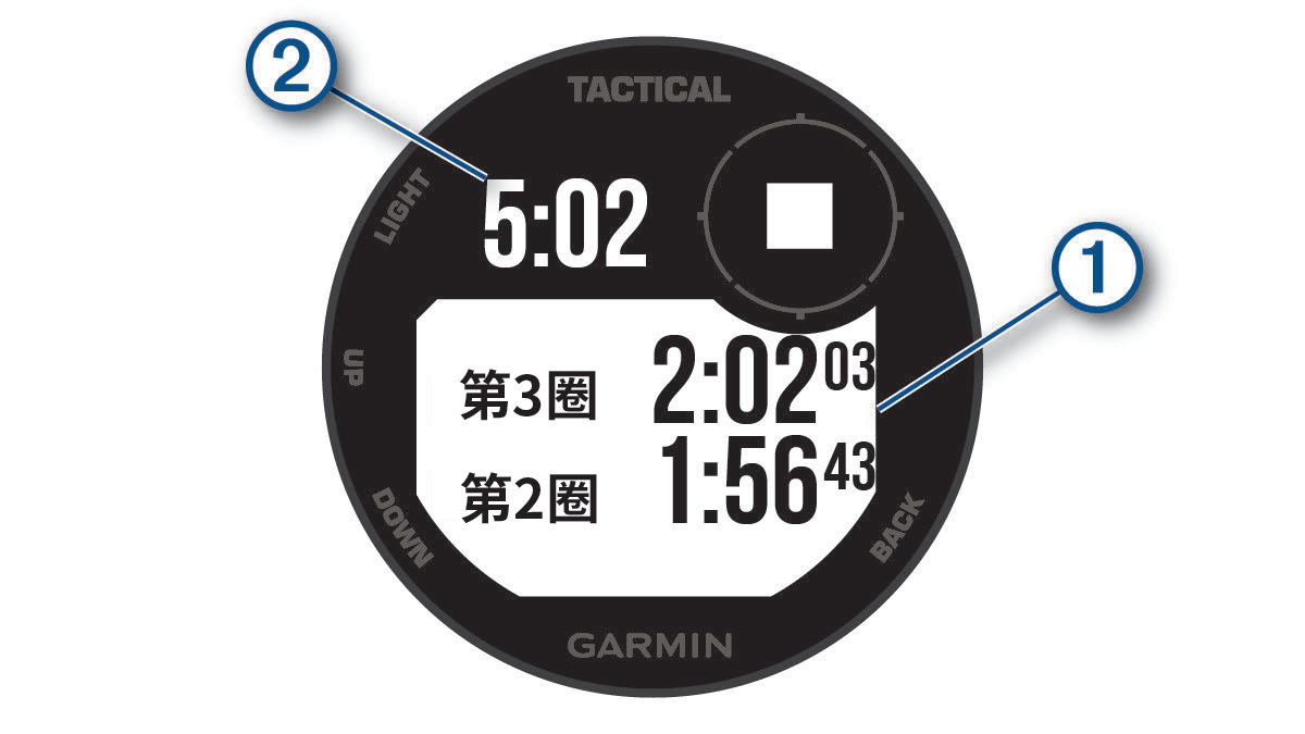 使用秒表 在任何页面,长按 SET 键。 选择 秒表。 按下 GPS 键开始计时。 按 SET 键重新开始计时 ①。 码表总计时 ② 仍会继续计时。 按下 GPS 停止两个计时器。 选择 UP,选择一个项目。 主页时钟使用秒表