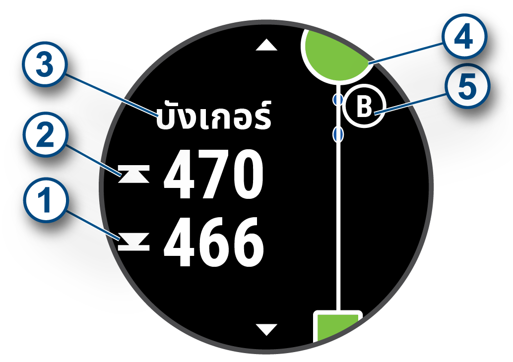 คุณสามารถดูระยะทางไปยังอุปสรรคตามแฟร์เวย์สำหรับหลุมพาร์ 4 และ 5 ได้ อุปสรรคที่มีผลต่อการเลือกช็อตถูกแสดงแยกออกจากกันหรือเป็นกลุ่มเพื่อช่วยให้คุณกำหนดระยะทางไป layup หรือ carry