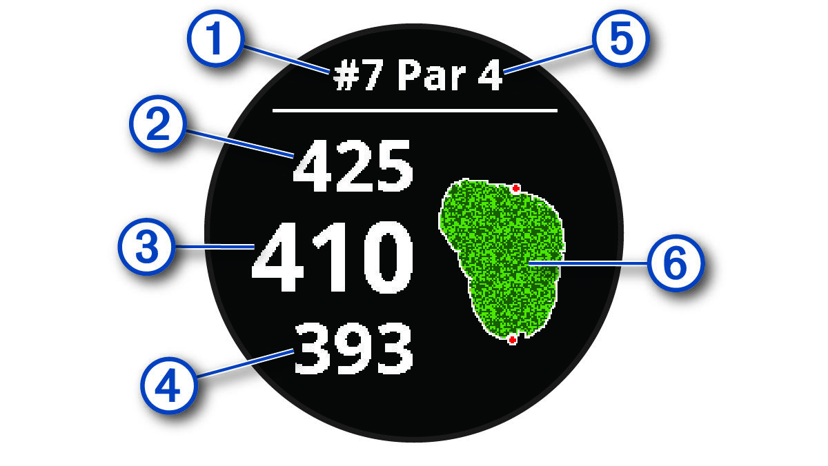 设备计算从您的位置到果岭前、中、后沿,以及选取的旗杆的距离(移动旗杆,第13页)。
