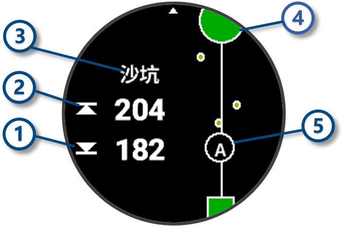 查看障碍区您可以查看总体位置与球道上各个障碍区的距离(标准杆 4 杆和 5 杆)。设备可以单独或分组显示会影响挥杆选择方式的障碍区,协助您确定放置球点与滚地距离。 在球洞信息页面上按动作键 ,然后选择 。与最近障碍区前方 ① 和后方 ② 的距离显示在屏幕上。障碍区类型 ③ 列于屏幕最上端。果岭以半圆形图示 ④ 显示在屏幕最上端,果岭下方的线条代表球道中线。障碍区 ⑤ 以相对于球道的某些位置显示在果岭下方。 上下滑动屏幕以查看当前球洞其他障碍区。 主页应用程序及活动模式高尔夫查看障碍区
