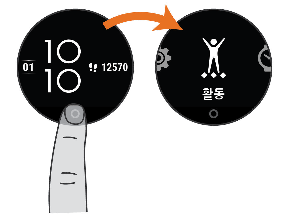 위젯과 메뉴 보기 시계 화면에서 를 눌러 메인 메뉴를 볼 수 있습니다. 시계 화면에서 화면을 아래로 밀어 컨트롤 메뉴를 볼 수 있습니다. 시계 화면에서 화면을 좌우로 밀어 위젯을 볼 수 있습니다. 홈소개위젯과 메뉴 보기