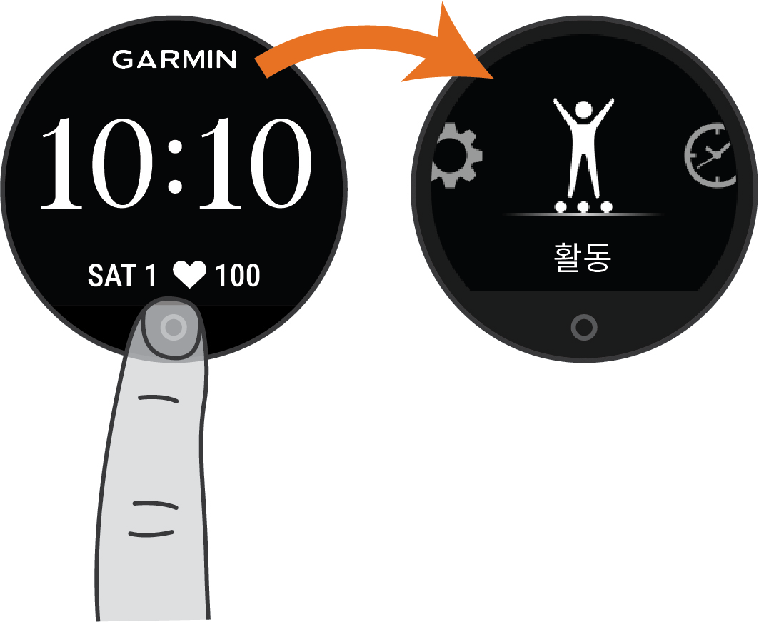 위젯과 메뉴 보기 메인 메뉴를 보려면 워치 화면에서 를 누릅니다. 컨트롤 메뉴를 보려면 워치 화면에서 화면을 아래로 밀어 봅니다. 위젯을 보려면 워치 화면에서 화면을 좌우로 밀어 봅니다. 홈제품 소개위젯과 메뉴 보기