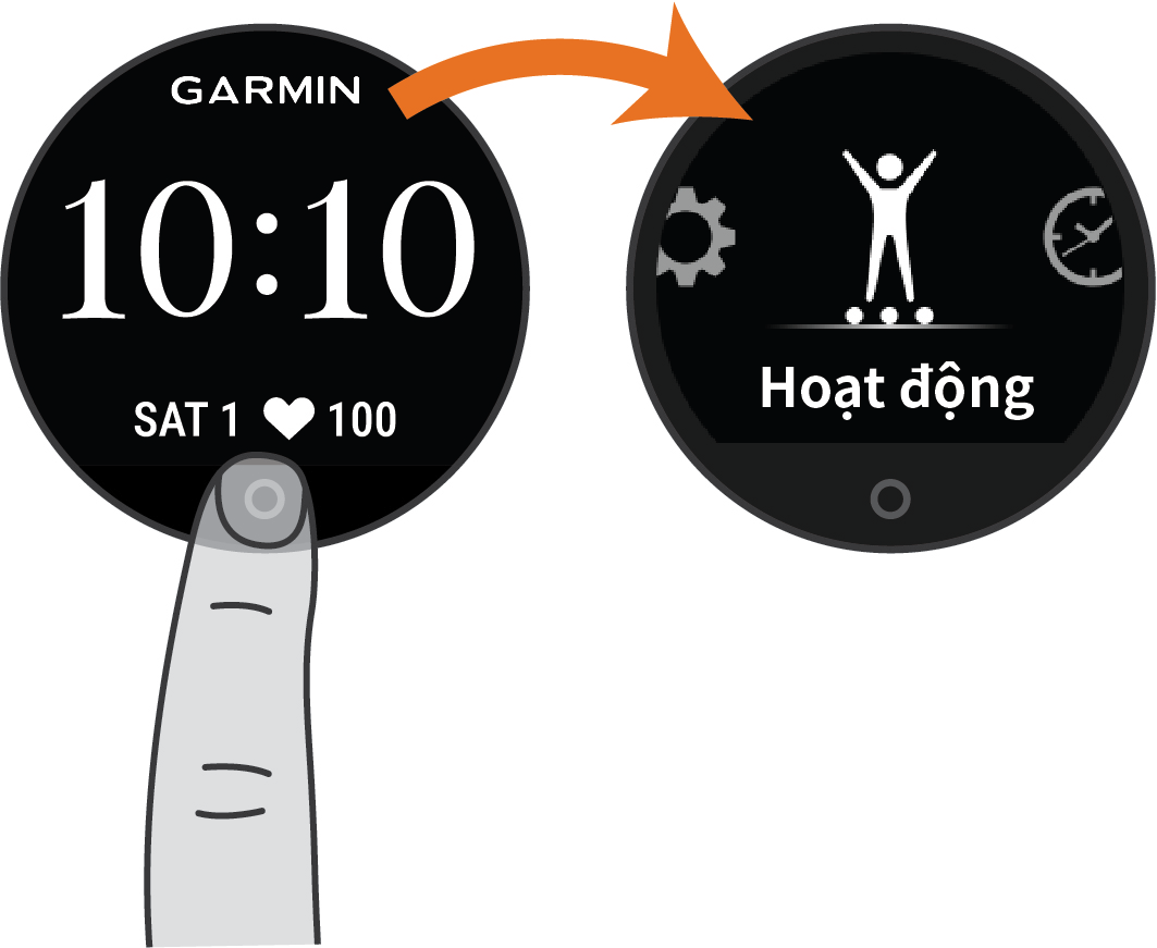 Xem công cụ và trình đơn Từ mặt đồng hồ, nhấn để xem trình đơn chính. Từ mặt đồng hồ, vuốt xuống để xem trình đơn điều khiển. Từ mặt đồng hồ, vuốt sang trái hoặc phải để xem các công cụ khác. Trang chủGiới thiệuXem công cụ và trình đơn