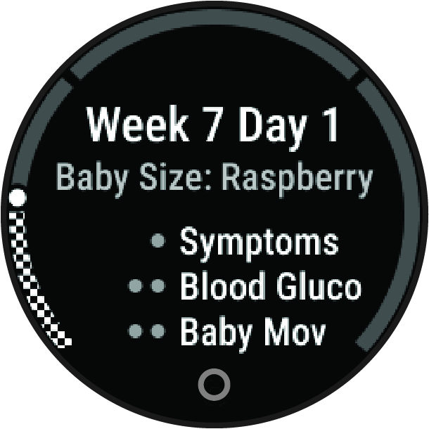 The pregnancy tracking feature displays weekly updates on your pregnancy and provides health and utrition information. You can use your watch to log physical and emotional symptoms, blood glucose readings, and baby movement (Logging Your Pregnancy Information). You can learn more and set up this feature in the Health Stats settings of the Garmin Connect app.