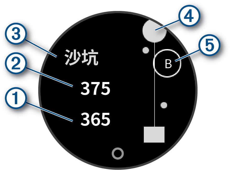 当手表侦测到挥杆时,Par 标准杆下方会显示您与挥杆位置之间的距离 ①。