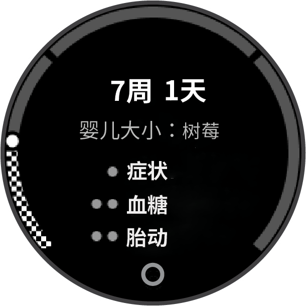 孕期追踪功能每周更新并显示孕期状态,提供相关健康和营养信息。你可以用腕表记录身体和情绪症状、血糖读数和胎动(记录孕期信息)。可以在 Garmin Connect 应用程序的健康统计设置中了解更多并设置此功能。