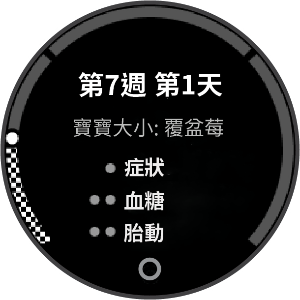 懷孕追蹤功能顯示每週懷孕的更新狀態,並提供健康及營養資訊。您可以使用您的手錶記錄生理和心理的症狀、血糖讀數,以及胎動情形(記錄懷孕資訊)。您可以在 Garmin Connect app 的健康數據設定中設定此功能或瞭解更多。