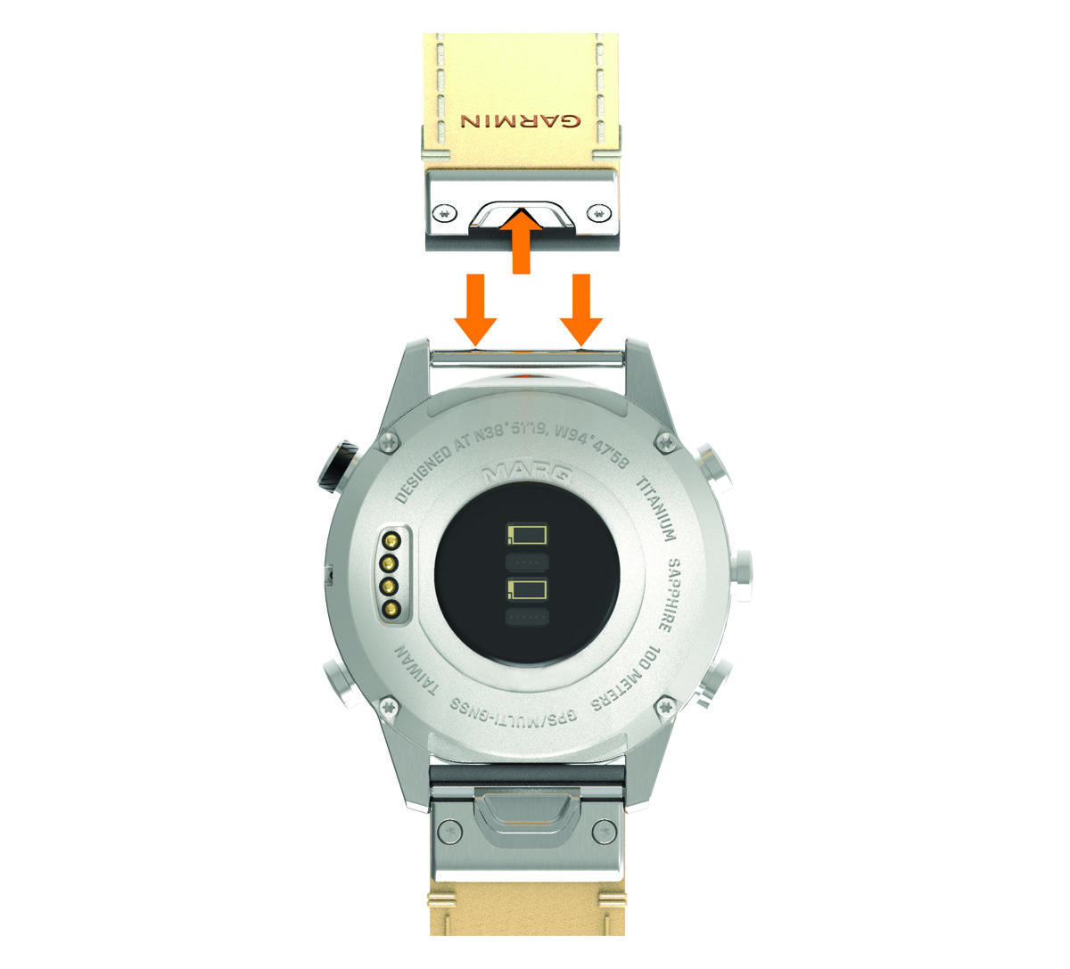 更換 QuickFit 快拆錶帶 滑動 QuickFit 快拆錶帶上的閂鎖,接著從錶上取下錶帶。 對齊新的錶帶與腕錶。 放置錶帶。備註:請確定錶帶牢固。閂鎖應緊閂住腕錶。 首頁裝置維護更換 QuickFit 快拆錶帶