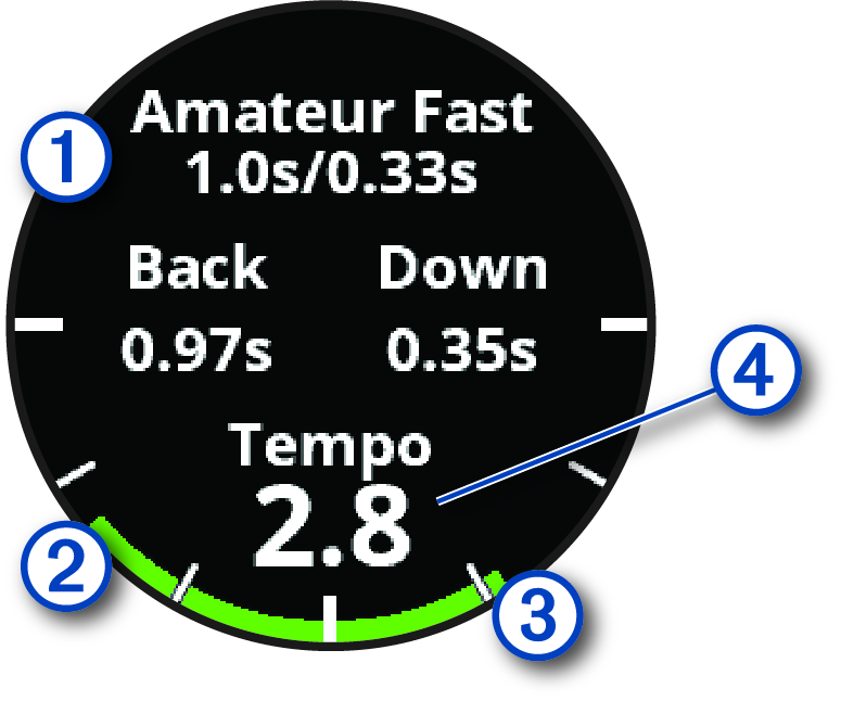You can achieve the ideal 3.0 tempo using different swing timings, for example, 0.7 sec./0.23 sec. or 1.2 sec./0.4 sec. Each golfer may have a unique swing tempo based on their ability and experience. Garmin provides six different timings.