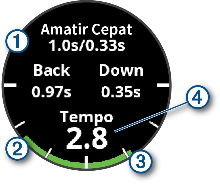 Aktivitas Latihan Tempo membantu Anda melakukan ayunan yang lebih konsisten. Perangkat mengukur dan menampilkan waktu backswing dan waktu downswing Anda. Perangkat juga menampilkan tempo ayunan Anda. Tempo ayunan adalah waktu ayunan ke belakang dibagi dengan waktu ayunan ke bawah, dinyatakan dalam rasio. Rasio 3 banding 1, atau 3,0, adalah tempo ayunan ideal berdasarkan studi pemain golf profesional.