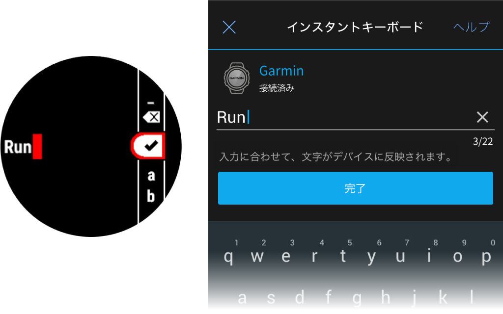 - インスタントキーボードを使用するには、ペアリング済みのスマートフォンでGarmin Connectアプリを開いている必要があります。(バックグラウンド起動では機能しません。)