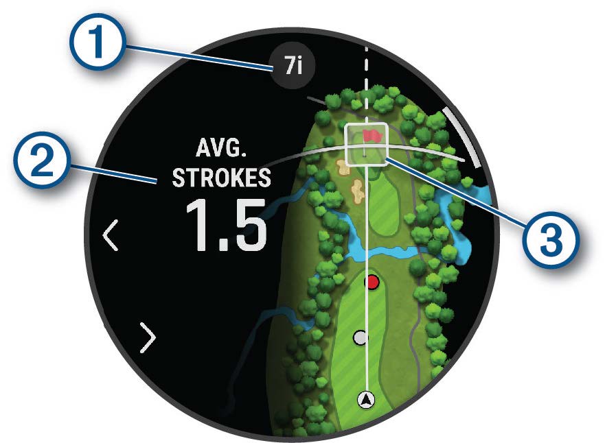 가상 캐디 기능을 사용하려면 먼저 Approach CT10 센서를 사용하여 5라운드를 플레이하거나 클럽 안내 설정을 활성화하고(활동 및 앱 설정) 스코어카드를 업로드해야 합니다. 각 라운드에서 Garmin Golf 앱이 설치되어 있는 페어링된 휴대폰에 연결해야 합니다. 가상 캐디는 풍향/풍속 데이터, 각 클럽의 과거 기록, 홀을 기반으로 권장 사항을 제시합니다.