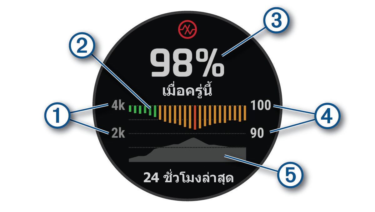 การอ่านเครื่องวัดออกซิเจนในเลือดของคุณปรากฏเป็นค่าเปอร์เซ็นต์ความอิ่มตัวของออกซิเจนและสีบนกราฟได้บนนาฬิกา คุณสามารถดูรายละเอียดเพิ่มเติมเกี่ยวกับการอ่านค่าเตรื่องวัดออกซิเจนในเลือดของคุณได้ รวมทั้งแนวโน้มต่าง ๆ ในหลายวันที่ผ่านมาได้บนบัญชี Garmin Connect ของคุณ
