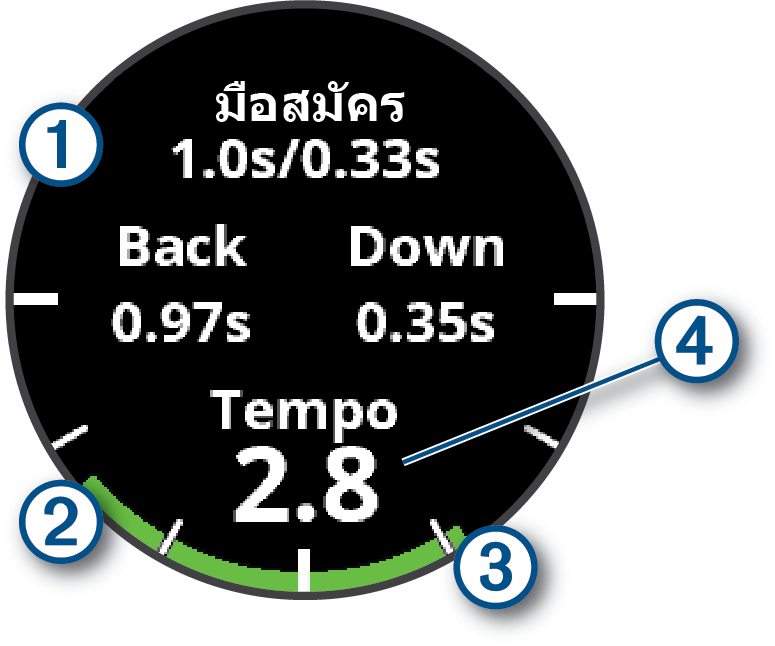 คุณสามารถบรรลุจังหวะการสวิง 3.0 ในอุดมคติได้โดยการใช้การควบคุมจังหวะวงสวิงที่ต่างกัน ตัวอย่างเช่น 0.7 วินาที/0.23 วินาที หรือ 1.2 วินาที/0.4 วินาที นักกอล์ฟแต่ละคนอาจมีจังหวะการสวิงที่แตกต่างกันไปตามความสามารถและประสบการณ์ของพวกเขา Garmin มอบการควบคุมจังหวะหกแบบที่แตกต่างกัน