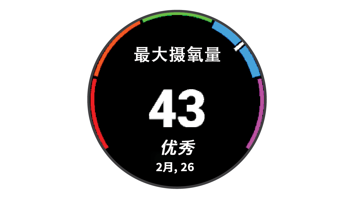 最大摄氧量是您在表现最好时,每分钟每公斤体重的最大耗氧量(以毫升为单位)。简单来说,最大摄氧量是运动成效的指标,而且它应该会随着您的体能进步而提升。MARQ Adventurer 设备已将跑步和骑乘的最大摄氧量估算数值分开,不论您戴着表在室外跑步或是将 Garmin 设备与兼容的功率计配对,以中强度的状态进行几分钟后,即可得到正确的最大摄氧量。