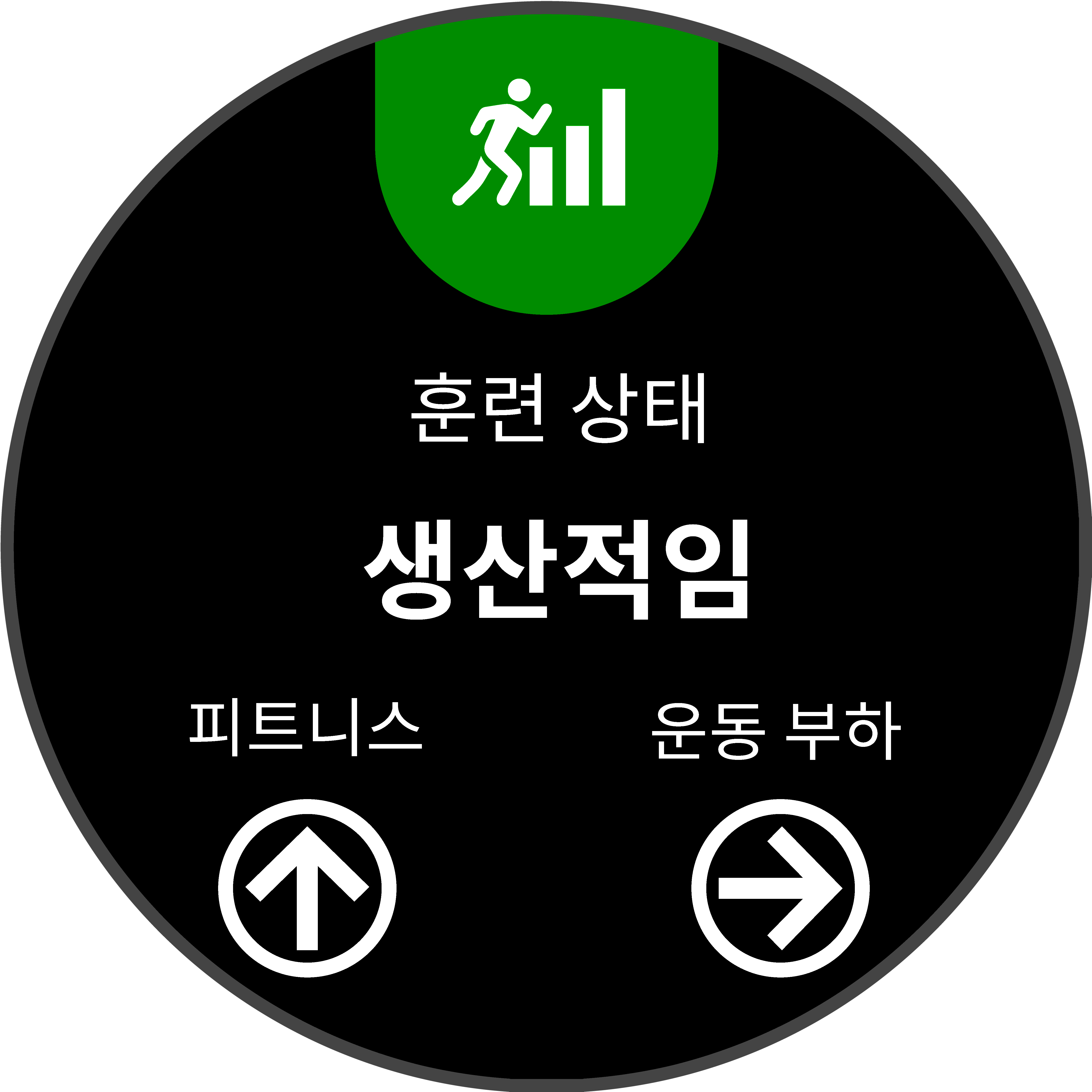 훈련 상태: 훈련 상태는 귀하의 훈련이 운동능력과 성과에 어떠한 영향을 끼치는지를 보여줍니다. 훈련 상태는 장기간 동안의 훈련 부하와 최대 산소섭취량 (VO2 max)의 변화를 기준으로 합니다.