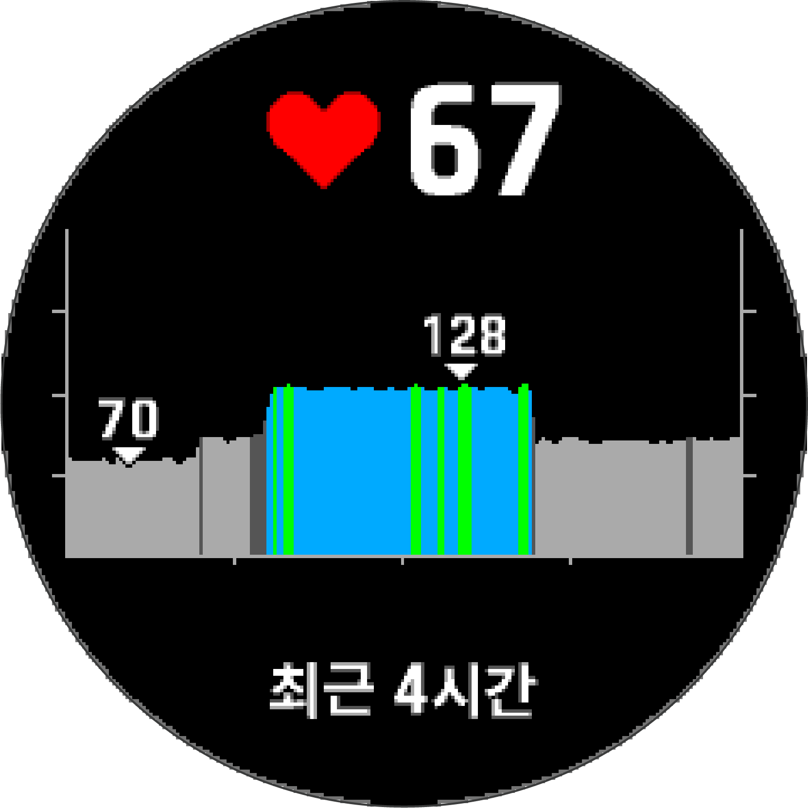 심박수 위젯 보기이 위젯에는 분당심박수(bmp) 단위의 현재 심박수, 지난 4시간 동안의 심박수 그래프가 표시됩니다. 시계 회면에서 UP 또는 DOWN을 눌러 심박 위젯을 확인합니다. START를 눌러 지난 7일 간의 평균 안정 시 심박수 값을 확인합니다. 홈심박수 측정 기능손목 심박심박수 위젯 보기