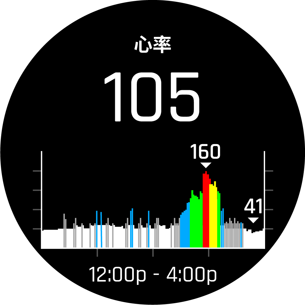 查看心率小工具查看您的目前心率(bpm)与过去4小时的心率图。 在表盘主画面时,按下 UP 或 DOWN 键找到心率小工具。 按下 START 查看过去七天的平均静止心率。 主页心率功能腕式心率查看心率小工具